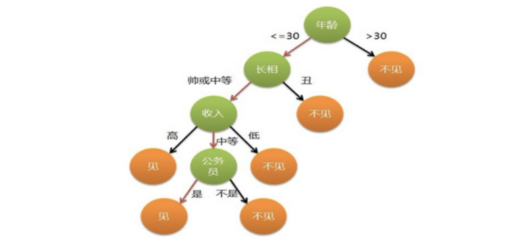 作为女孩的你在决策过程就是典型的分类树决策。相当于通过年龄、长相、收入和是否公务员对将男人分为两个类别:见和不见。