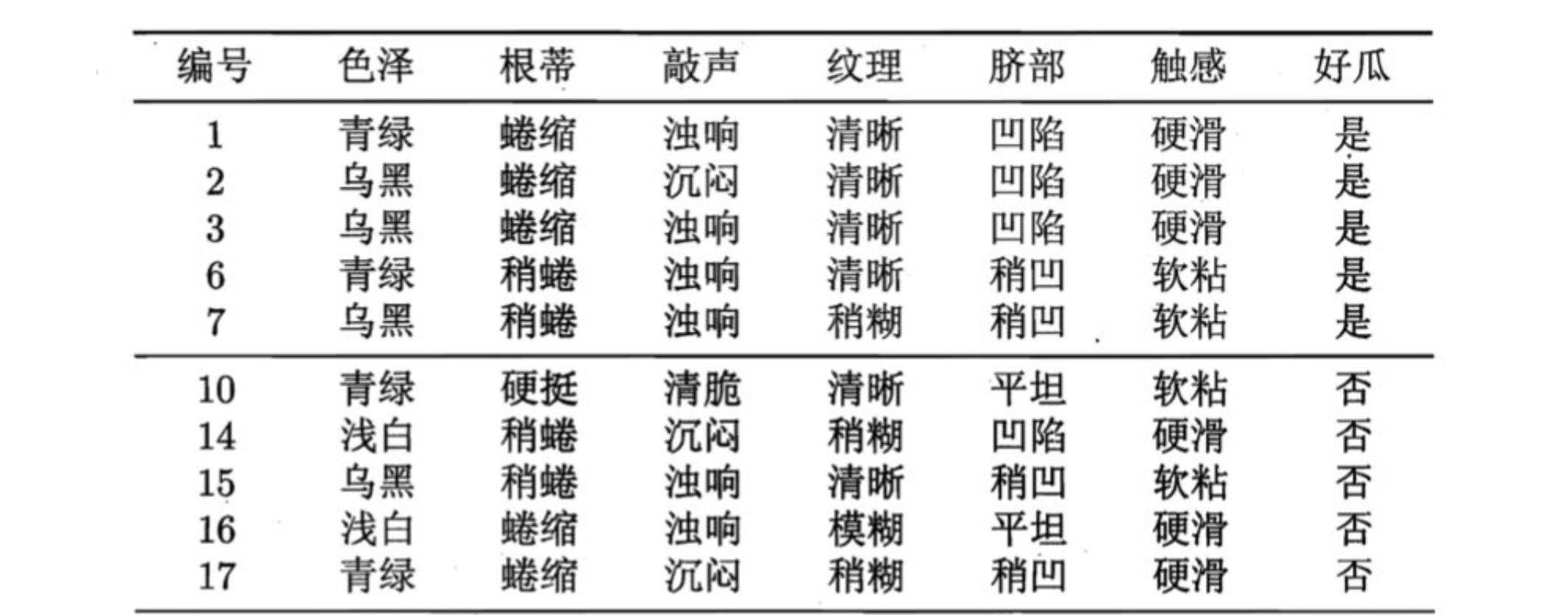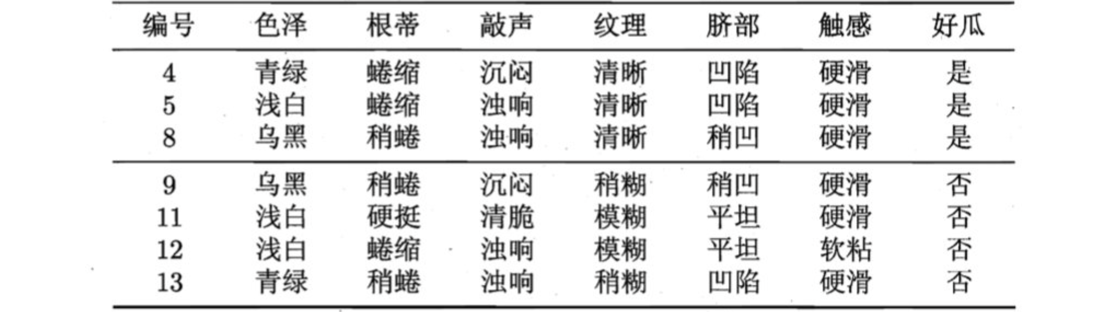 在构建树时, 为了能够实现剪枝, 可预留一部分数据用作 “验证集” 以进行性能评估。我们的训练集如下: