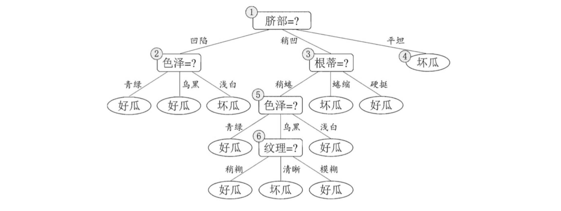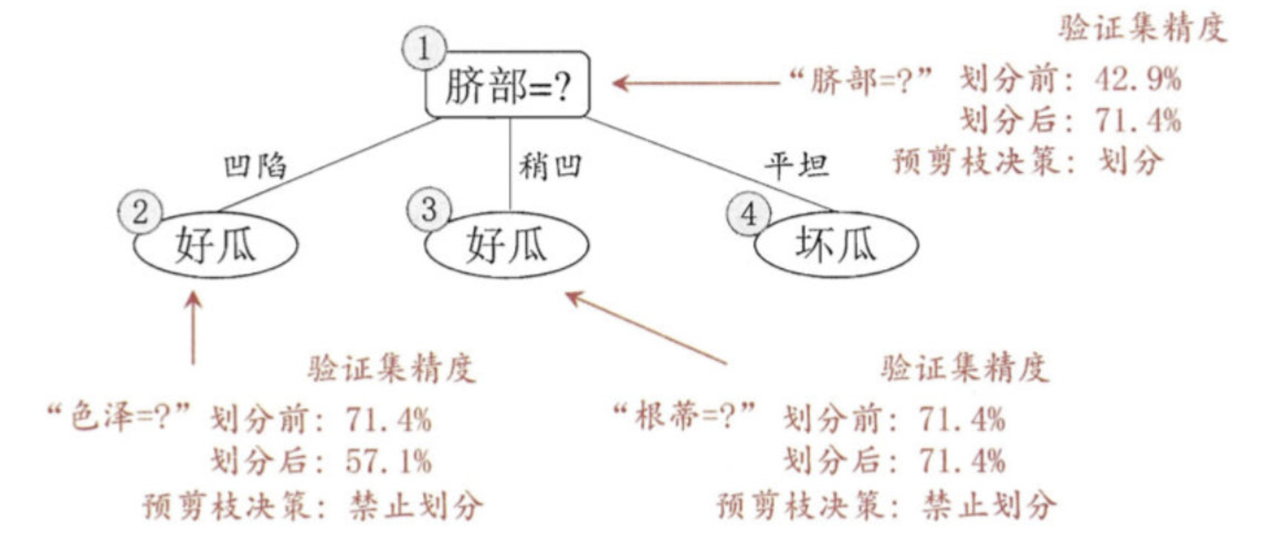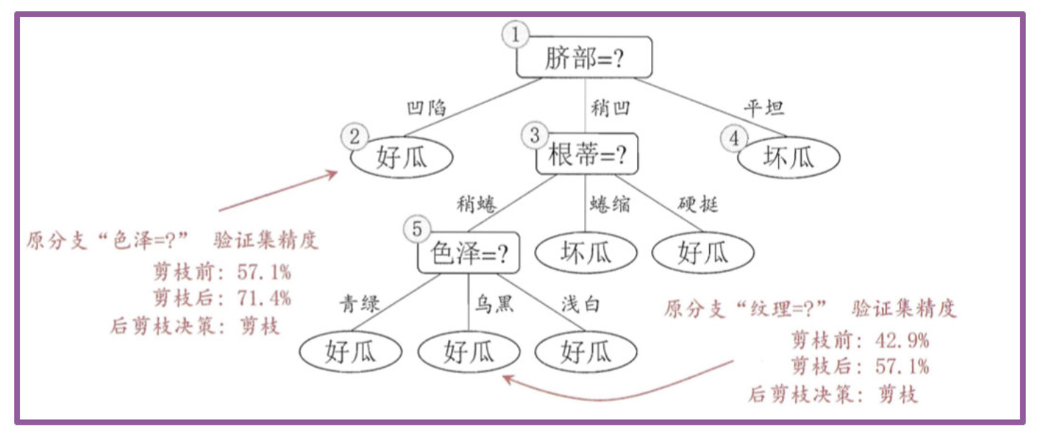 - 对结点3和1,若将其领衔的子树替换为叶结点,则所得决策树的验证集 精度分别为 71.4% 与 42.9%,均未得到提高,于是它们被保留。