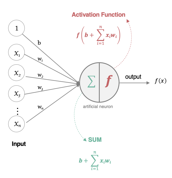 这个流程就像,来源不同树突(树突都会有不同的权重)的信息, 进行的加权计算, 输入到细胞中做加和,再通过激活函数输出细胞值。