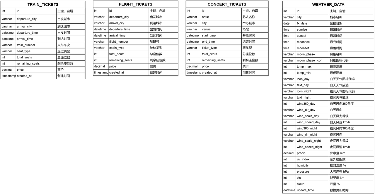 作用:存储票务数据(火车票、机票、演唱会票),供 mcp_ticket_server.py 查询,支持 ticket_server.py 的票务查询功能。存储天气数据,供mcp_weather_server.py查询,支持weather_server.py天气查询功能。